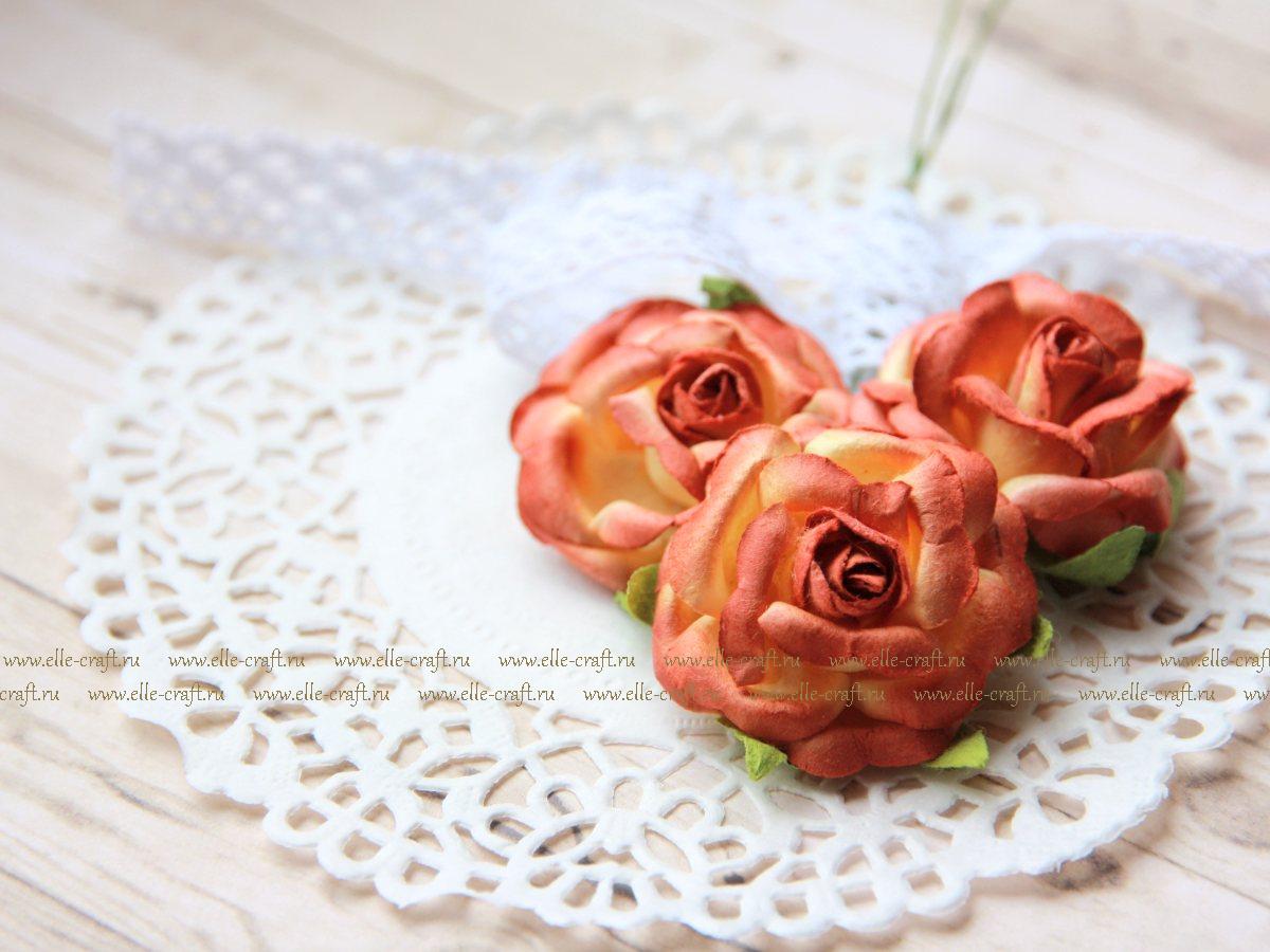 Нежные бумажные розы диаметром 3,5 см насыщенного красно-оранжевого цвета, которые украсят вашу открытку ручной работы, страничку и любой другой скрап-проект.